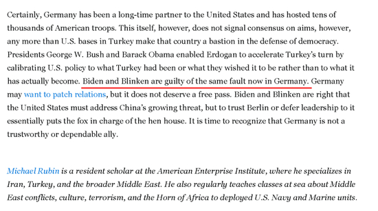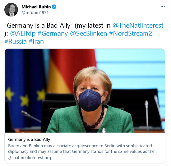 如下图所示,昨天,美国右翼保守派学者迈克尔·鲁宾,就在美国右翼媒体《国家利益》杂志上刊登了一篇文章,大骂德国是个“坏盟友”。