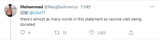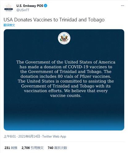 美国驻特立尼达和多巴哥大使馆当地时间13日晚在其官方推特发布声明称,“美国政府已向特立尼达和多巴哥政府捐赠80 瓶辉瑞新冠疫苗。美国致力于帮助特立尼达和多巴哥政府开展疫苗接种工作。”根据美国媒体此前报道,一瓶辉瑞新冠疫苗包含5或6剂疫苗,换言之,80瓶疫苗仅相当于400多剂疫苗,按照一人两剂的接种流程,只够为200多人接种。或许是美国大使馆自己也意识到“80瓶”的可笑之处,还特意在声明结尾补充称,“我们相信每一剂疫苗都很重要”。