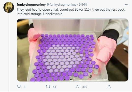 @funkdrugmokey:他们(美国政府)必须打开一盒疫苗,从中数出80瓶(或115瓶),然后将其他疫苗放回冷库。难以置信。