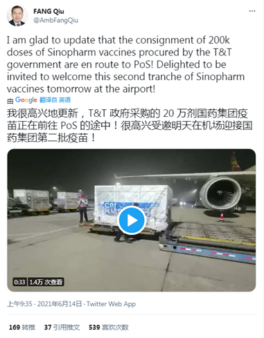 当地时间13日,中国驻特多大使方遒在其官方推特和脸书上宣布了上述消息。“我很高兴公布这一最新动态,特立尼达和多巴哥政府采购的 20 万剂国药集团疫苗正在前往西班牙港的途中!很高兴受邀明天在机场迎接国药集团第二批疫苗!”方遒大使还透露,预计下个月还将有一批中国疫苗运抵特多。