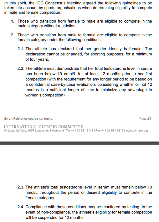 1。运动员必须声明自己的性别身份是女性,并且(出于体育竞技目的)至少四年内不能更改。
