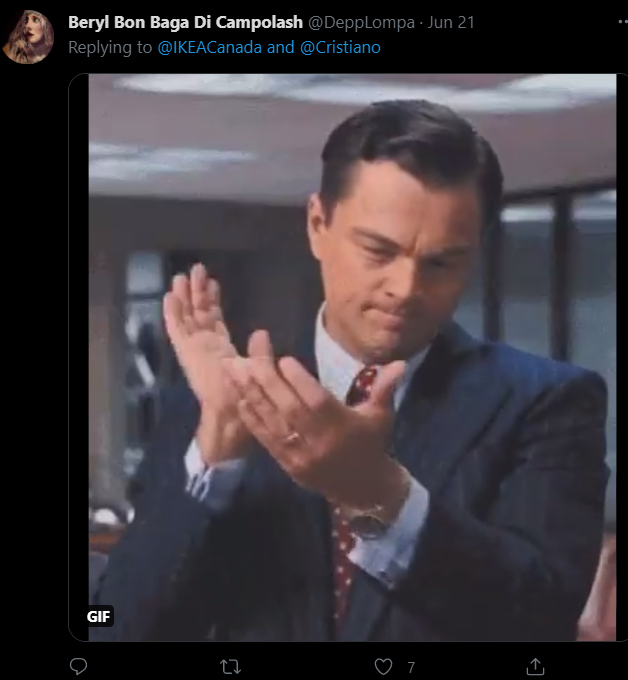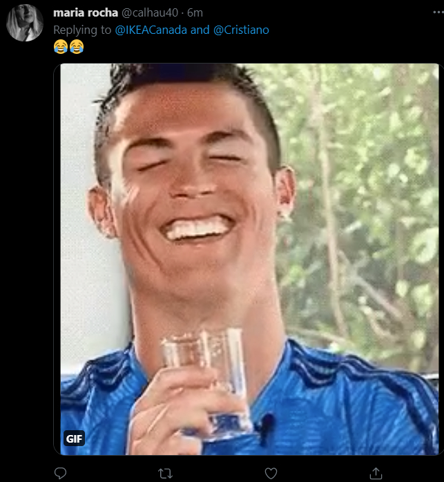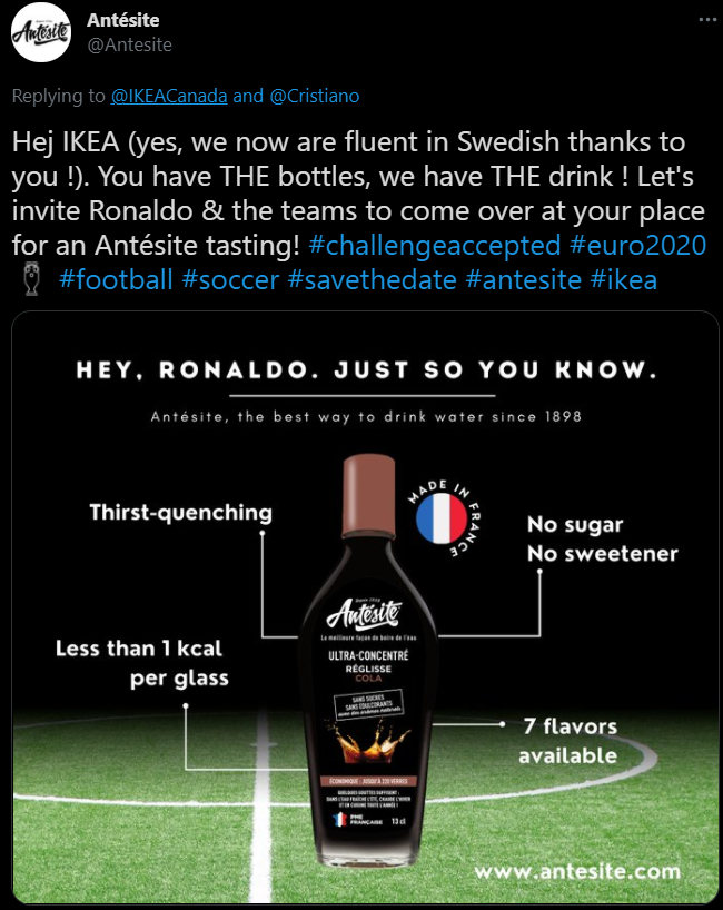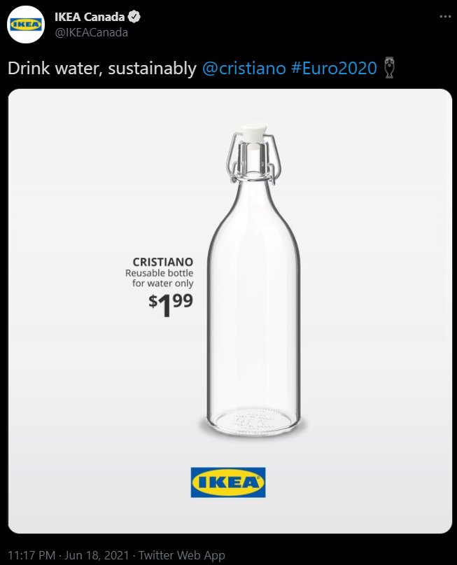 瑞典知名家居零售商位于加拿大的推特账号于18日发布了一则产品宣传的推文,并附上了一张图片。图片中可以看出,产品为宜家热销的软木塞玻璃瓶,日常可用来存水。然而图片中的文字却与以往宣传有所不同:“克里斯蒂亚诺,可重复使用的瓶子,仅供喝水使用”。此外,该账号还配文陈述道,“可持续的喝水吧”,并在最后@了C罗、添加了“2020欧洲杯”的话题标签。