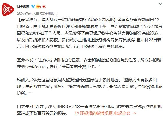 原标题:老鼠横行,澳大利亚一监狱被迫疏散了400余名囚犯