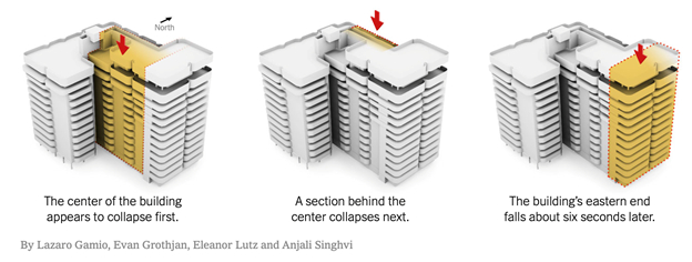 报道指出,大楼垮塌时呈现的这种“分段式倒塌”现象,或由多种原因导致——包括设计缺陷,建楼时(40年前)的建筑规范下所允许的结构不够牢固等。不过,如若没有一些关键性的故障点,这种大面积的垮塌是“极不可能发生的”。而在反复观看、检查纪录了事故发生经过的监控视频后,相关调查人员初步确定了几个较为可能的“故障点”。