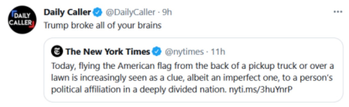 美国保守派认为这篇文章是在承认保守派现在拥有美国的爱国主义。自称是传统主义者的西奥菲勒斯·奇尔顿在推特上回复《纽约时报》称,“同意。如果你热爱你的国家,那你的政治立场可能偏右。”↓