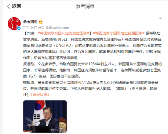 据韩联社首尔消息,当地时间7月6日,韩国总统文在寅在青瓦台主持召开韩国国务会议时就联合国贸易和发展会议(UNCTAD)正式认定韩国为发达国家一事表示,韩国作为名副其实的发达国家获得国际社会认可,作为发达国家,韩国要承担相应的国际责任,积极发挥作用,沿着发达国家道路继续前进。