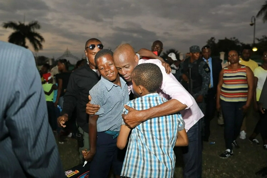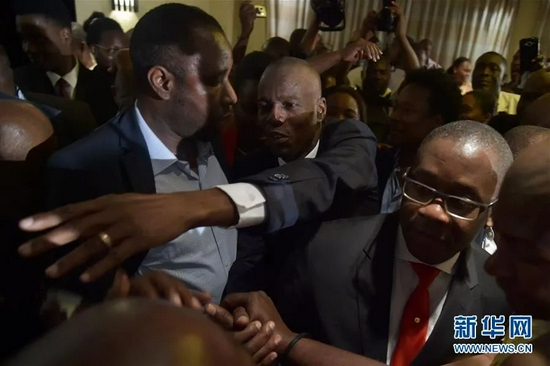 ·2017年1月3日,在海地首都太子港,选举法院宣布大选结果有效后,莫伊兹(中)接受祝贺。图片来源:新华网。