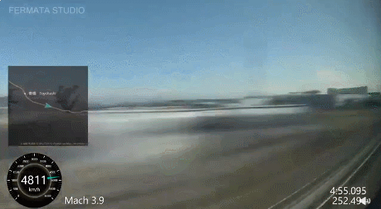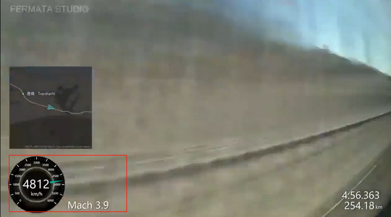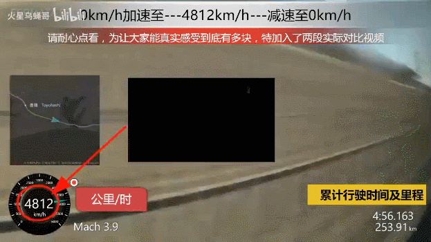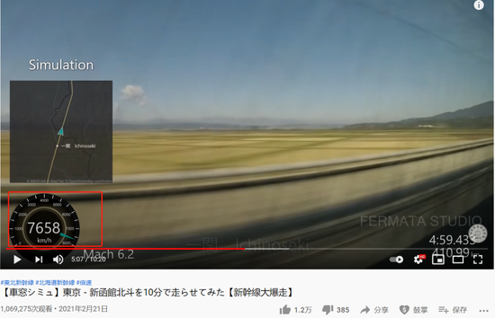 视频中,列车从位于大阪的新大阪站缓缓驶出,一路加速,屏幕左下角的虚拟速度仪显示,列车最高速度达到了每小时4812km,接近4倍音速(1224km/h),比我国最快的歼击机——歼20(最高时速超过3000km)还要快。随后列车开始减速,最后缓缓驶进东京站。