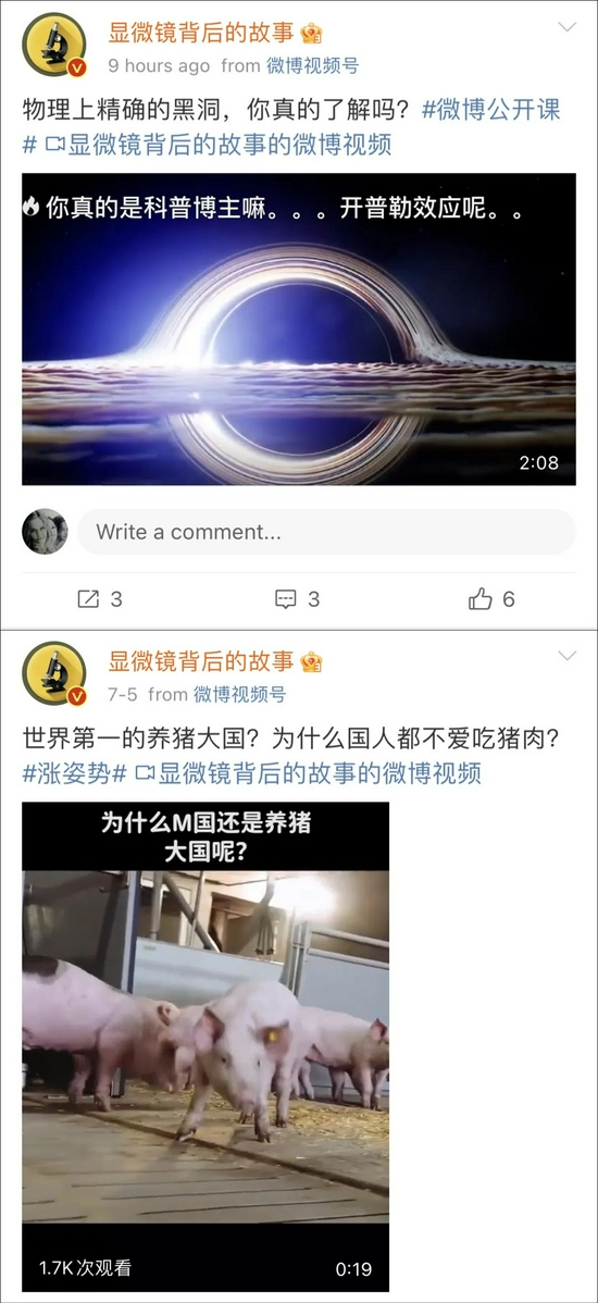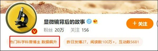 微博认证为泛科普视频博主的账号@显微镜背后的故事,每天高频率搬运视频,其中包括不少有争议的内容,虽然每天微博互动量很低,但该账号拥有20万粉丝。