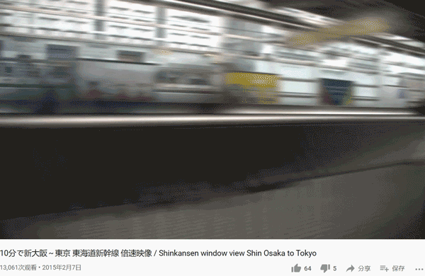 实际上,此类通过窗景模拟交通工具超高速的视频并不少,同样是“10分钟从新大阪到东京”,另一个YouTube博主制作的就能很明显看出是倍速视频,连人影都模糊了。