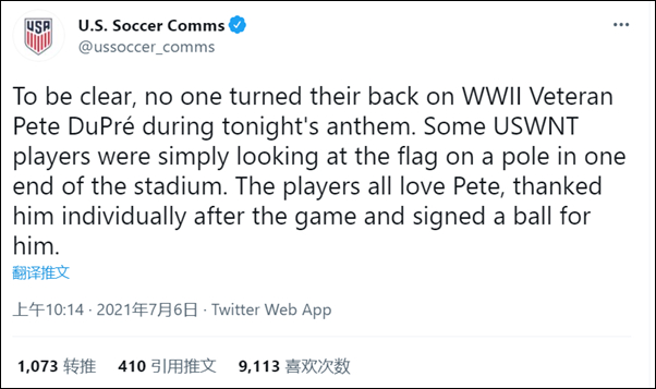 对此,美国国家女子足球队否认“背对二战老兵”,解释说有些队员只是在看体育场另一端的国旗。美国足球协会当地时间7月5日发表声明称:“让我们解释清楚,在今晚奏国歌时,没有人背对着二战老兵皮特·杜普雷。一些美国国家队球员只是看着体育场一端的杆子上的国旗。球员们都很喜欢皮特,在赛后单独感谢了他,并为他签了一个球。”中场球员卡莉·劳埃德(Carli Lloyd)在推特上反驳说:“我们转过身,是因为我们要面对着国旗。”