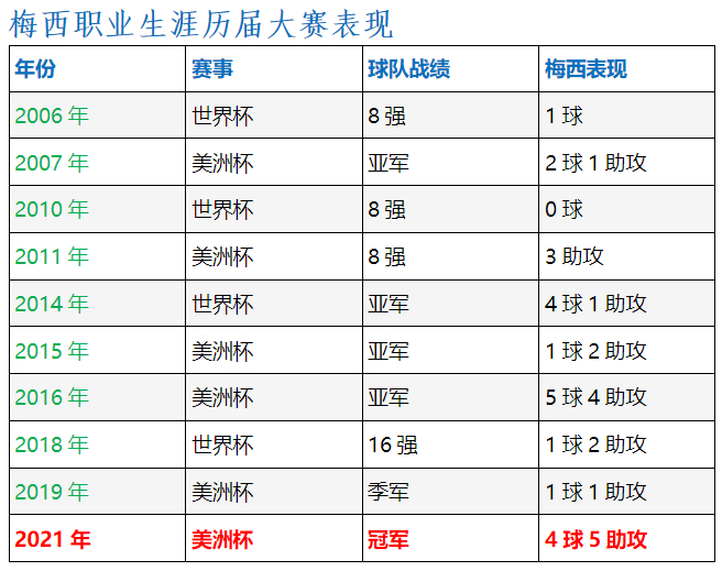 2011年至2019年,梅西4次率队参加美洲杯,2次折戟决赛,还有1次季军。尤其是2015年和2016年,阿根廷队连续2年与智利队会师决赛,接连在点球大战中失利。2016年美洲杯结束后,心灰意冷的梅西一度退出国家队。