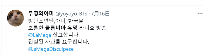 “举报嘲讽防弹少年团、ARMY(防弹少年团粉丝团)和韩国的哥伦比亚著名广播电台LaMega。