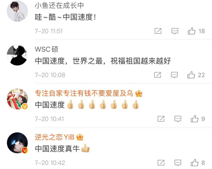 在今天微博平台上,“时速600公里”“中国速度”等字眼刷屏。不少中国网友激动不已、称赞连连。↓