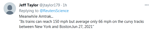 “与此同时的美国铁路……‘它的列车可以达到时速150英里(约240公里),但在纽约和波士顿之间弯曲铁路上的列车平均时速只有66英里。’”