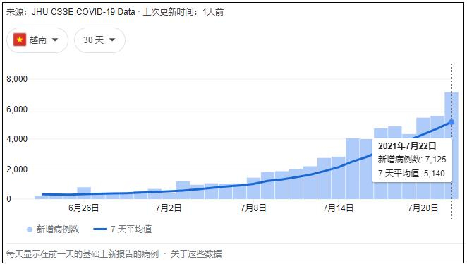 自去年4月以来,越南的新增病例数屡创新高。虽然政府已经将工人列入疫苗接种的优先名单,但许多省份的工业区仍发生了群体性感染。据美国约翰斯·霍普金斯大学最新统计,7月22日,越南日新增新冠确诊病例达7125例,死亡36例。