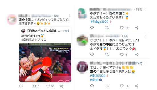 在喜悦的欢声之外,另一个冲上日本热搜榜的关键词是“那个中国”(あの中国)。很多日本网友在得知乒乓夺金之时,都提到“能打败‘那个中国’真是太厉害了。”