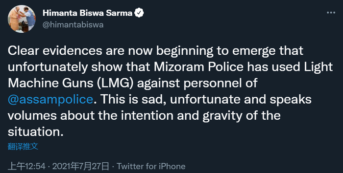 《印度斯坦时报》7月27日报道称,当地时间7月24日,阿萨姆与米佐拉姆两邦的首席部长出席了由印度内政部长阿米特·沙阿主持的会议。就在两天后的7月26日,两个邦共计约数千名平民与警察在瓦伊伦格泰(Vairengte)镇的边界处发生激烈冲突。
