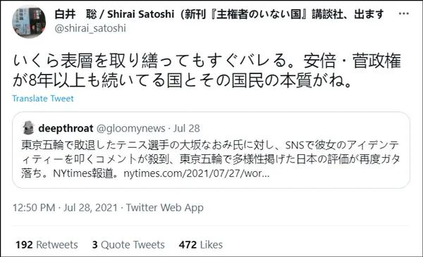 此事被外媒报道后,有日本人开始“反思”。7月28日,日本学者、京都精华大学政治学老师白井聪转发《纽约时报》报道感叹:“无论怎么修饰表面,本质马上就会暴露的。(这就是)安倍和菅义伟政府执政超过8年的国家和国民的本质。”