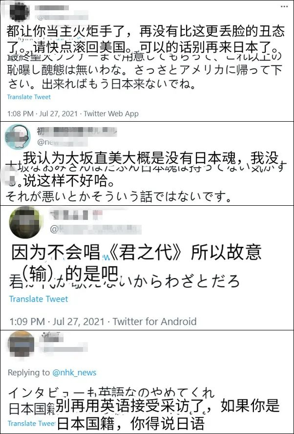 日前,世界排名第二的日本选手大坂直美在网球女单第三轮爆冷出局后,部分日本网民针对她的日美混血身份进行攻击,让她“滚回美国”,一些日媒的配图也很不友好。