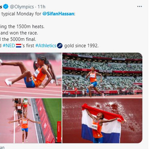 东京奥运会官方社交媒体账号上特别发布了哈桑跌倒后爬起来再夺小组第一的视频,并在配文中称,这名荷兰姑娘诠释了“永不放弃”的奥林匹克精神。