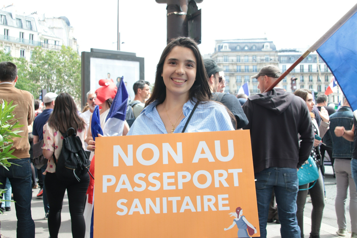 反对者们最常用的根据就是“个人自由”。在7月17日的游行中,队伍最前的条幅上便是大写的法语单词“LIBERTÉ”(自由)。手持这幅标语的人中就有法国极右运动“爱国者们”(Les Patriotes)的创始人弗洛朗·菲力博(Florian Philippot)。“我们聚集于此就是向马克龙的专制说不!”在游行正式开始前,他这样说道。连续的几场游行中,示威者们高喊自由,他们认为在民主社会是不是注射疫苗应该完全由个人决定。
