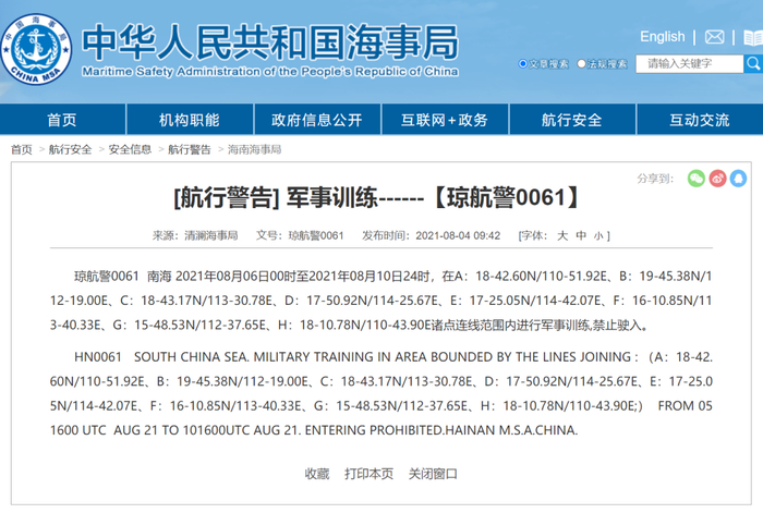 海南海事局4日发布航行警告显示,从6日0时至10日24时,将在“范围达到10万平方公里”的广阔南海海域将举行军事训练。