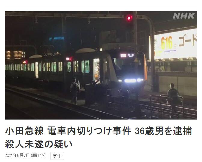 据日本HNK8月7日报道称,事发时小田急线列车正行驶在东京世田谷区成城学园前站附近,在被砍伤的10人中,一名20多岁女大学生被捕被砍7刀,伤势较重,其余9人伤势较轻。随后列车在祖师谷大藏站前紧急停车,嫌疑人则扳开车门跳车沿铁轨逃走,但菜刀和手机均遗落在车上。