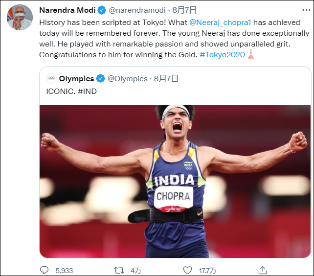 印度总理莫迪也在推特上祝贺他,“历史在东京改写!乔普拉今天所取得的成就将被永远铭记,他展现出了非凡的激情以及无与伦比的毅力。”