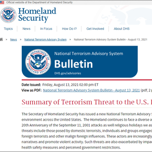 [文/观察者网 熊超然]2001年9月11日,震惊世界的“9·11恐怖袭击事件”发生。就在该事件发生将满20年前夕,美国国土安全部(DHS)于当地时间8月13日发布了一则最新的“恐怖主义威胁警告”——《国家恐怖主义咨询系统公报》(NTAS)。