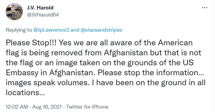 另有一位网民还质疑这张照片的真实性。他自称“去过美国驻阿富汗使馆的每个地方”,但从那张照片的背景看,拍摄照片的背景和国旗很可能并不是在美国使馆内。截至目前,《星条旗报》记者还未对这一评论做出回复。