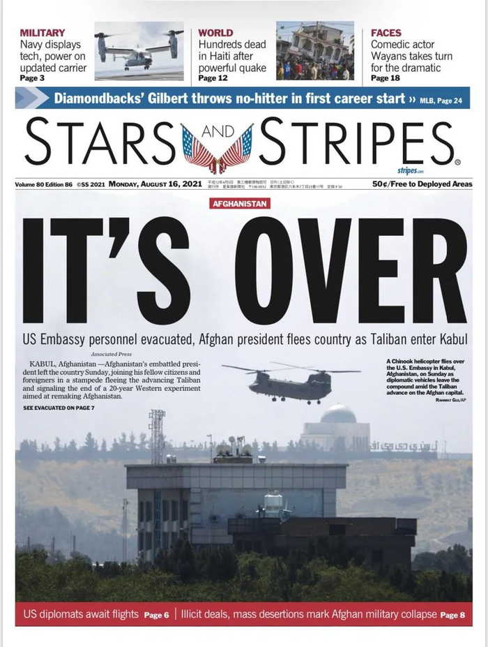 在今(16)日的《星条旗报》头版上,头条的标题则是一句“都结束了”,配上美军直升机撤走工作人员的场面,让标题显得简短又丧气。在评论区,有美国网民感叹:“这一切确实都结束了,从这一刻开始,美国和阿富汗都要为自己的命运负责了。”