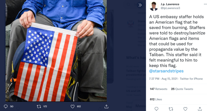 随着塔利班的攻势日盛,美国驻阿富汗大使馆也进入了撤离的最后阶段。不过,即使在这个并不体面的事情中,富有想象力的美国媒体人还是找到了一个宣传“亮点”。故事,还得从下面这张图里的美国国旗说起。