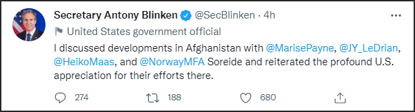 15日,美国国务卿布林肯官方推特号转发了联合声明,并发推称与澳、法、德、挪威外长讨论了阿富汗局势的进展,并“再次表达了美国对于这些国家在阿做出的努力的深深感谢。”
