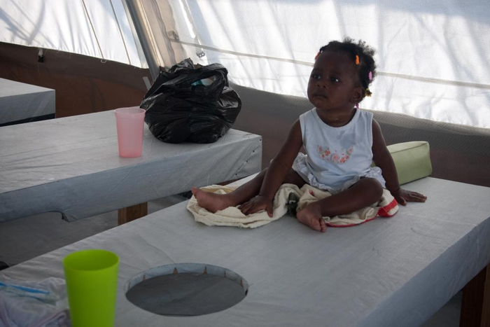 2011年1月15日,在太子港近郊一所“无国界医生”霍乱治疗中心内,一名海地女孩坐在病床上。新华社记者王沛摄