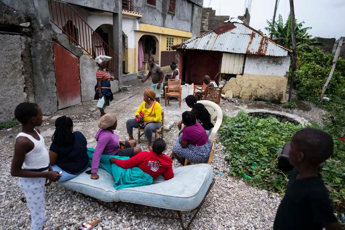 2021年8月17日,在海地莱凯,人们聚集在房屋外。新华社记者戴维·德拉帕斯摄