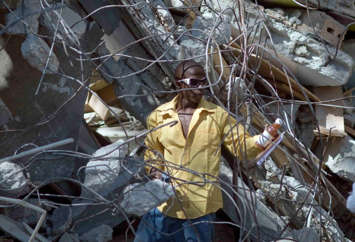 2010年1月23日,在海地首都太子港,一名男子在废墟间翻找还能用的物品。新华社记者戴维·德拉帕斯摄
