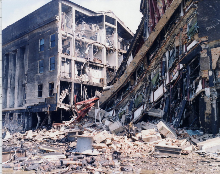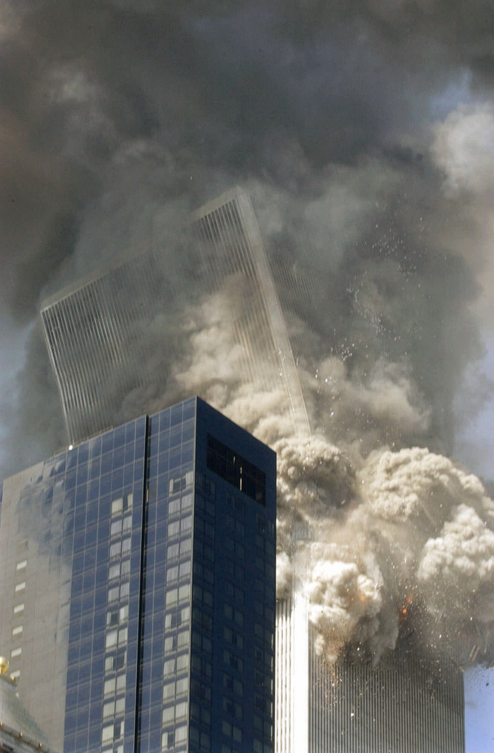 撞击后不到2小时,世贸大厦南塔、北塔先后垂直倒塌,现场浓烟翻滚,遮天蔽日。
