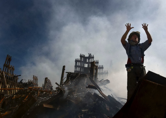 当地时间2001年9月15日,一名消防队员在双子塔被毁现场大声呼救。在世贸中心的废墟上,大火整整持续燃烧了三个月,救援人员更是花费了数月时间清理瓦砾。直到恐袭过后6个月,世贸中心遗址地面上的150万吨瓦砾才完全清理干净。