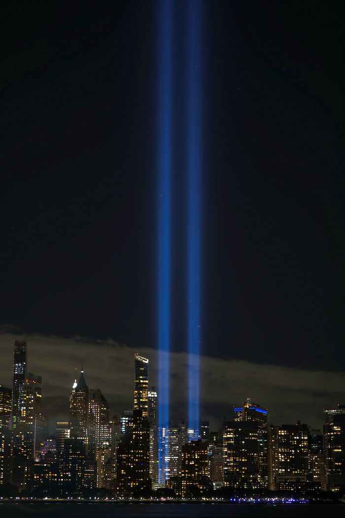 当地时间2020年9月11日,美国纽约点亮象征世贸中心双子塔的光柱,纪念“9·11”恐怖袭击19周年。