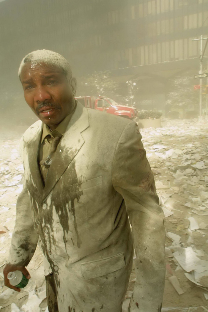 当地时间2001年9月11日,双子塔倒塌后,一名满身灰尘的男子在废墟边走边用水冲洗脸上的粉尘。