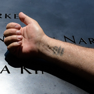 当地时间2021年6月8日,美国纽约,9.11事件幸存者Joseph Dittmar展示其右腕上的“9·11”纹身。9·11事发时他在世贸中心南塔105层工作。这名现今44岁的四个孩子的父亲从南塔105层逃离的经历是一部悲剧史诗,他的记忆还像发生那天那样清晰。