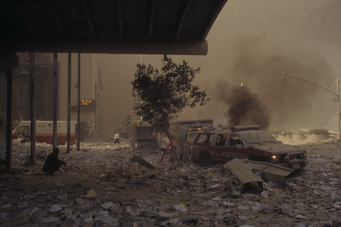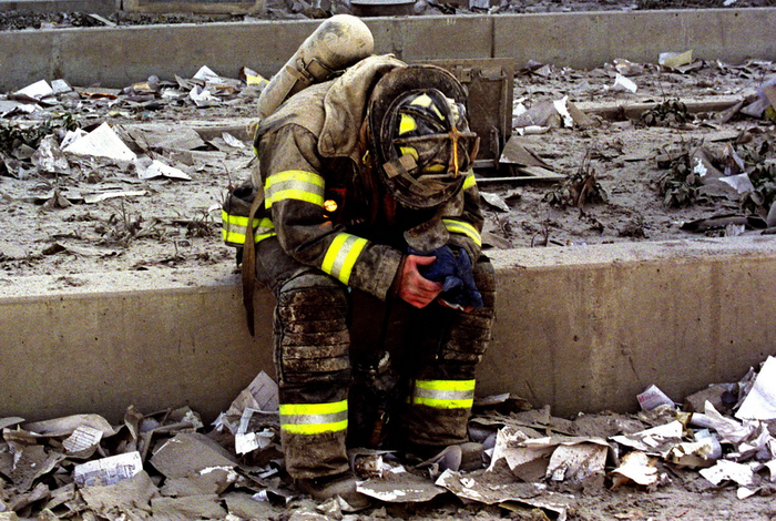 当地时间2001年9月11日,一名消防人员无助地坐在废墟中。北塔被袭击后至当日9时,200余名纽约市消防人员进入北塔开始救援行动。北塔倒塌时,他们没来得及撤离。