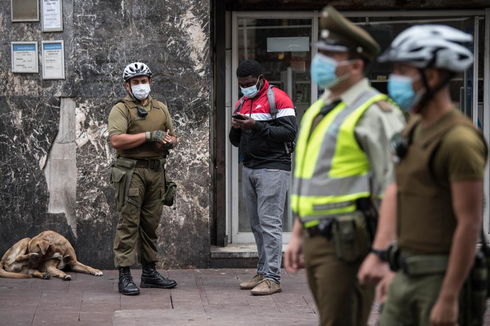 3月25日,警察在智利首都圣地亚哥市中心检查行人的出行许可。新华社发(豪尔赫·比列加斯摄)
