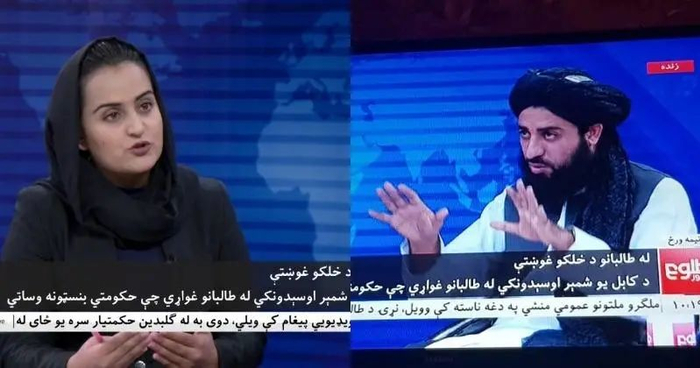积极的变化也是有的。17日,阿富汗黎明新闻台(Tolo News)负责人宣布,已在新闻播报中重新启用女性主持人。该电视台随后发布女主持人阿甘德采访塔利班成员赫马德的视频,采访视频(下图)显示,主持人并没有用面纱遮挡面部。