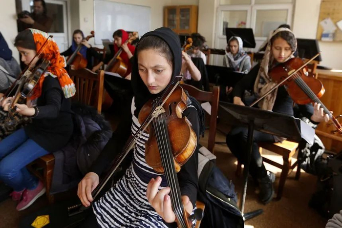 2018年,阿富汗国家音乐学院学生在学校排练。