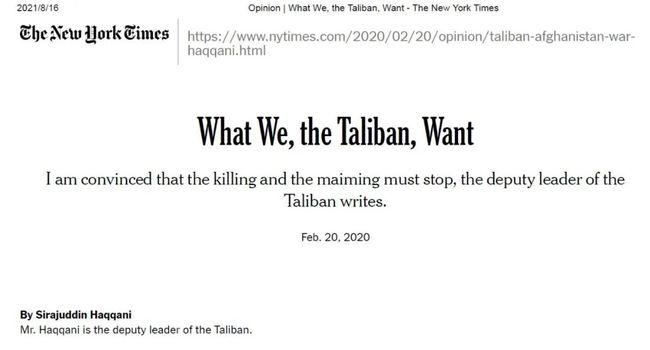 ↑2020年2月塔利班与美国和谈期间,西拉杰丁·哈卡尼在《纽约时报》发表评论文章《我们塔利班想要什么》一文,引发轰动。