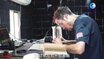 他常年只用一支毛笔、一种墨水,写竖排繁体字。渐渐地,他摸索出了独特的绘画风格:中英文诗词与人物水墨画结合。