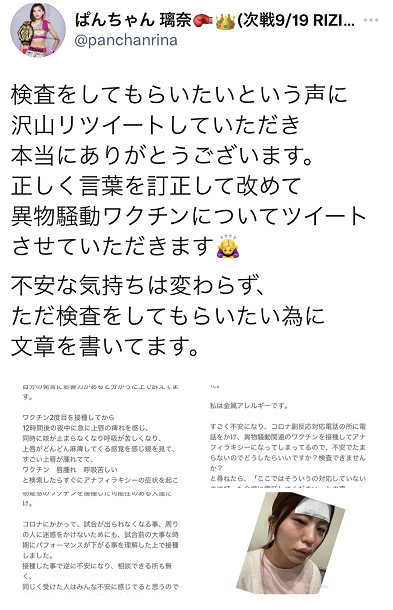 “NEWS post seven”称,尽管日本厚生劳动省等有关方宣称涉事疫苗不存在安全风险。不过,已经有对金属过敏的人在接种涉事疫苗后发生急性过敏性反应,日本女性自由搏击运动员冈本璃奈就是其中的一人。冈本璃奈日前在推特上发推文称,自己对金属过敏,在接种了新冠疫苗后出现呼吸困难,上唇肿胀,身体麻痹等急性过敏性反应。