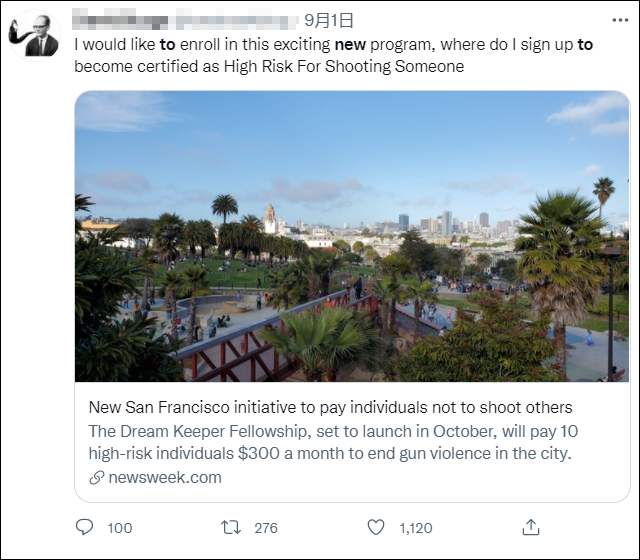 据《新闻周刊》(Newsweek)、《旧金山观察报》等多家美媒报道,近日,美国旧金山市推出了一项名为“梦想守护者奖金(Dream Keeper Fellowship)”的计划,该计划通过给那些“高枪击风险的人”(people at high risk of shooting someone)支付现金的方式,让他们不要开枪,以此来缓解该市近年来枪支暴力事件的激增趋势。